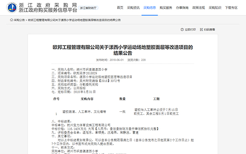 2019年5月29日歐邦工程管理有限公司關(guān)于湖州市藍(lán)天實驗幼兒園2019年塑膠改造維修工程的中標(biāo)(成交)結(jié)果公告