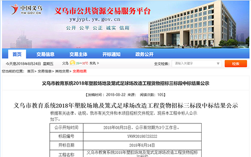 2018年8月22日中標(biāo)義烏市教育系統(tǒng)塑膠場地及籠式足球場改造工程項目公示