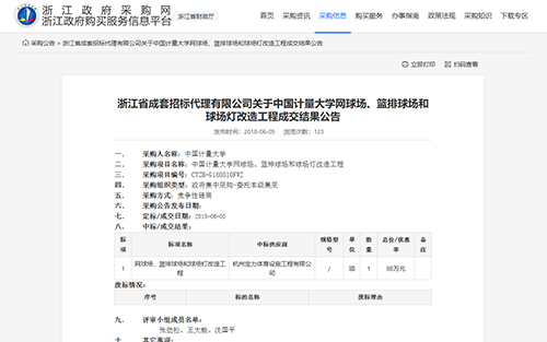 2018年6月5日中標(biāo)中國計量大學(xué)網(wǎng)球場、籃排球場和球場燈改造工程公告