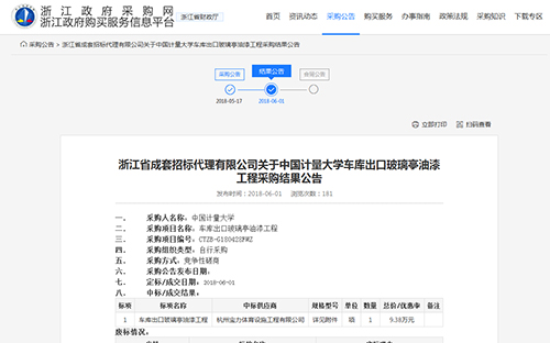 2018年6月1日中標(biāo)中國計量大學(xué)車庫出口玻璃亭油漆工程公告