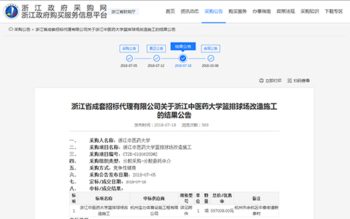 2018年7月18日中標(biāo)浙江中醫(yī)藥大學(xué)籃球場,排球場改造施工項目公告