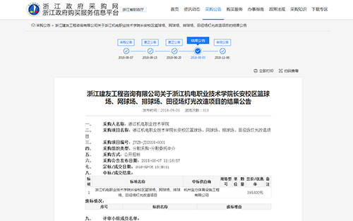 2018年9月5日中標(biāo)浙江機(jī)電職業(yè)技術(shù)學(xué)院長安校區(qū)籃球場,網(wǎng)球場,排球場,田徑場燈光改造項目公告