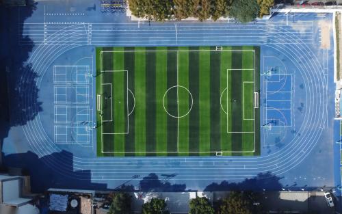 學(xué)校操場(chǎng)塑膠跑道施工工藝:清整場(chǎng)地基礎(chǔ)→鋪設(shè)瀝青/水泥底層→涂刷底膠增強(qiáng)粘結(jié)→分層攤鋪彈性EPDM顆粒層→噴涂防滑耐磨面層→精準(zhǔn)劃線標(biāo)識(shí)→養(yǎng)護(hù)固化。工藝需控制材料配比、溫度濕度,確保平整度、彈性和排水性能,符合環(huán)保及運(yùn)動(dòng)安全標(biāo)準(zhǔn)。