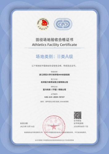 2025年11月,由杭州寶力體育設(shè)施工程有限公司承建的溫州市職業(yè)中等專業(yè)學(xué)校400米田徑場項(xiàng)目正式通過中國田徑協(xié)會驗(yàn)收,榮獲“II類B級田徑場地合格證書”。