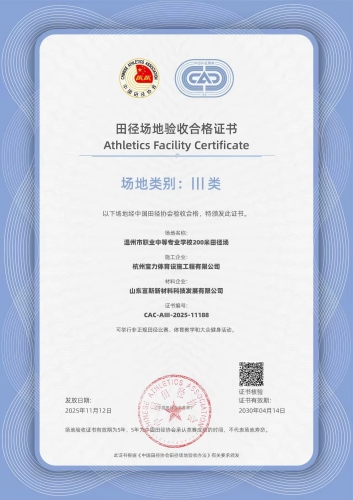2025年11月,由杭州寶力體育設(shè)施工程有限公司承建的溫州市職業(yè)中等專業(yè)學(xué)校200米田徑場項(xiàng)目正式通過中國田徑協(xié)會驗(yàn)收,榮獲“III類田徑場地合格證書”。