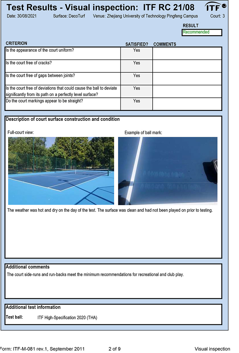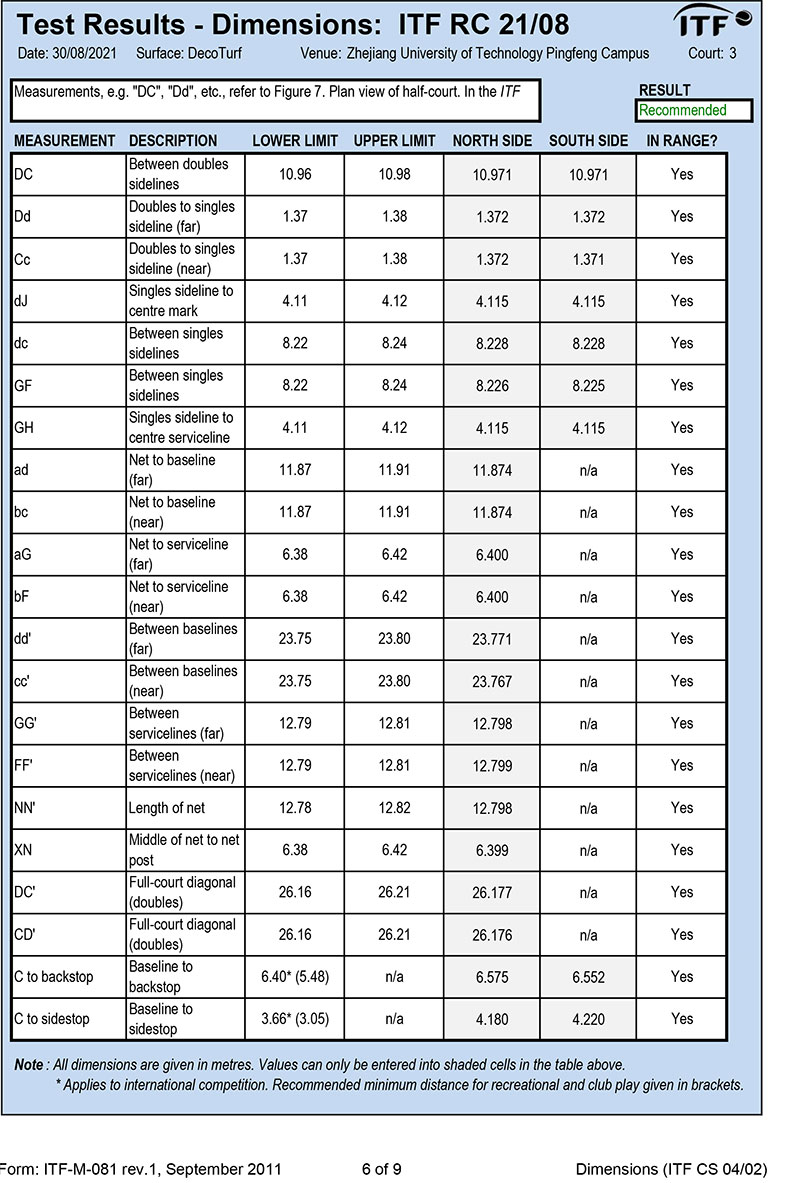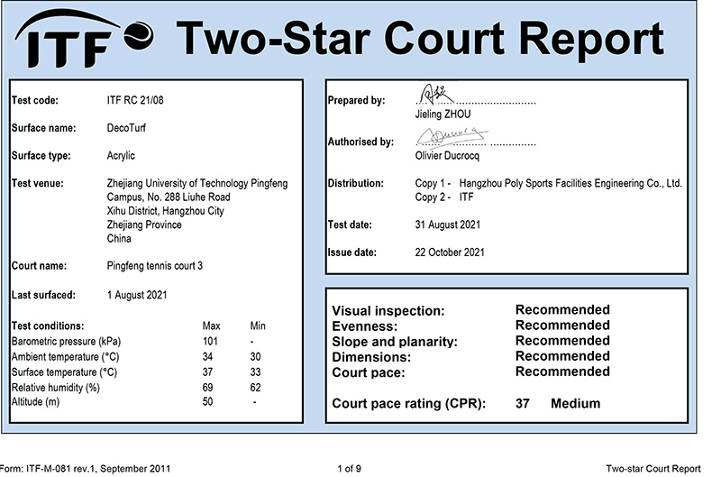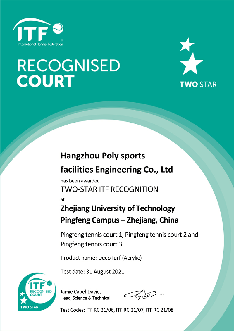 杭州寶力體育設(shè)施工程有限公司承建的浙江工業(yè)大學(xué)屏風(fēng)校區(qū)網(wǎng)球場改造工程,三片網(wǎng)球場均順利通過國際網(wǎng)聯(lián)ITF二星認(rèn)證。