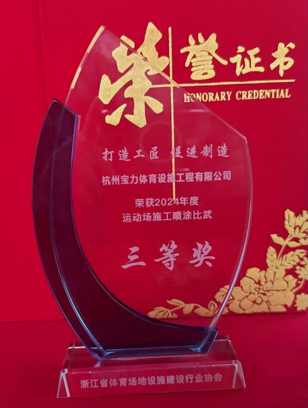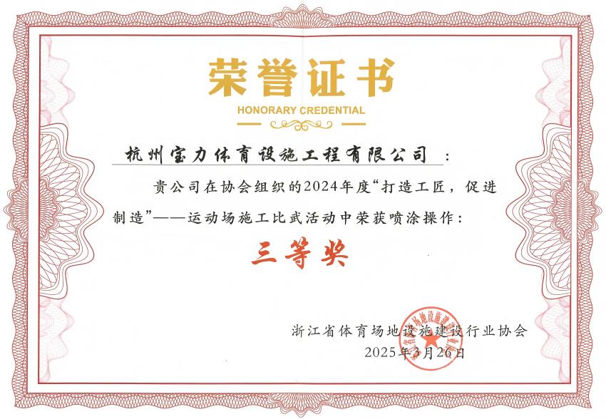 2025年3月26日,在浙江省體育場地設(shè)施建設(shè)行業(yè)協(xié)會舉辦的2024年度“打造工匠,促進制造”運動場施工比武活動表彰大會上,杭州寶力體育設(shè)施工程有限公司(以下簡稱“寶力體育”)憑借精湛的施工技術(shù)和卓越的團隊協(xié)作能力,榮獲“噴涂操作三等獎”。該獎項不僅充分印證了企業(yè)在專業(yè)施工領(lǐng)域的核心競爭力,更凸顯了寶力體育團隊以工匠精神打造精品工程的實踐成果。