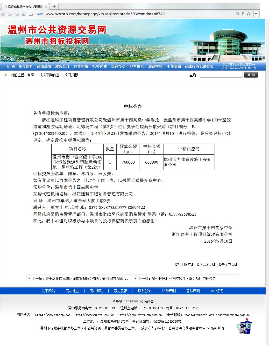 2015年9月10日中標(biāo)溫州市第十四高級(jí)中學(xué)100米塑膠跑道和塑膠運(yùn)動(dòng)場(chǎng)地、足球場(chǎng)工程(第二次)