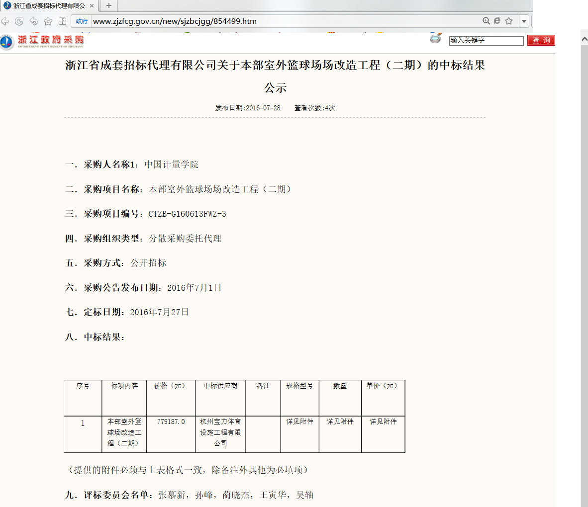 2016年7月27日中標(biāo)中國(guó)計(jì)量大學(xué)本部室外籃球場(chǎng)場(chǎng)改造工程(二期)